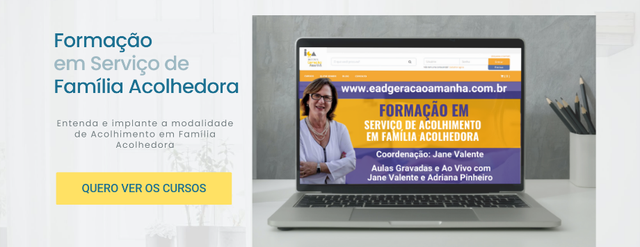 O Serviço de Acolhimento em Família Acolhedora (SFA) é um serviço que evolui diariamente em nosso país e, os profissionais que atuam na rede de proteção e estão sempre interessados no melhor interesse das crianças, têm buscado formas de se aprofundar no tema. Do básico ao avançado, a Formação Completa em SFA do IGA, é composta de 60 horas/aula com certificado, aulas em vídeos, apostilas + diversos materiais para baixar e consultar na prática diária, apresentação de fluxos, ferramentais e metodologias consolidadas, seção tira-dúvidas e bônus exclusivos, entre eles um roteiro com o passo a passo para a capacitação das famílias (avançado). Com a coordenação da Dra. Jane Valente e a participação da especialista Adriana Pinheiro, essa formação prepara o profissional para conhecer, entender, divulgar, implantar, gerir e realizar a proteção de crianças e adolescentes.