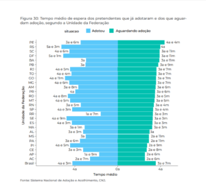O tempo médio entre a data do pedido de habilitação e a data da sentença de adoção dos pretendentes que adotaram alguma criança ou adolescente é de 4 anos e 3 meses, variando de 1 ano e 7 meses em Roraima e de 5 anos e 3 meses no Rio Grande do Sul.